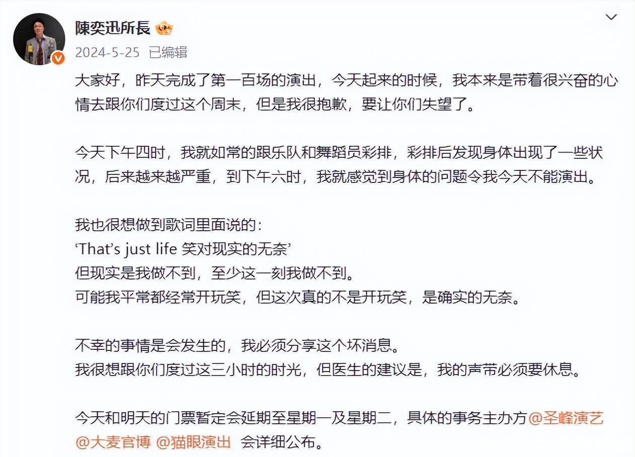 陈奕迅曾因取消演唱会在社交媒体道歉 然而,就在失声后不到一个月,陈奕迅又在室外打网球时中暑休克,倒地时下巴撞地导致腮骨骨裂,影响到了他的听力。最痛苦的时候,他甚至想过取消整场巡演。 8月8日,陈奕迅在澳门演唱会上唱《七百年后》的时候,突然按住胸口干呕,表情很痛苦。有网友认为,这是典型的焦虑症躯体化症状,不少歌迷也纷纷喊话,建议他注意休息,好好养病。 谈到康复近况,陈奕迅坦言身体还会出现焦虑反应,“会感到很紧张,心跳突然间控制不了,跳动很快,我又觉得自己不是很严重的程度,就继续服药。” 不过他也表示,过两天都会去看医生,“演出结束了,真的令人不会太过焦虑。”